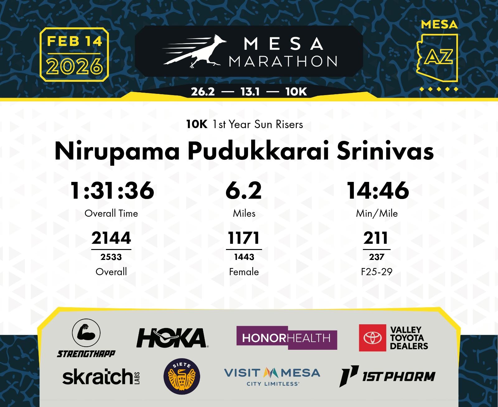 Date: Feb. 14, 2026 Participant: Nirupama Pudukkarai Srinivas #19359 Race: 2026 Mesa 10K Distance: 6.2 miles