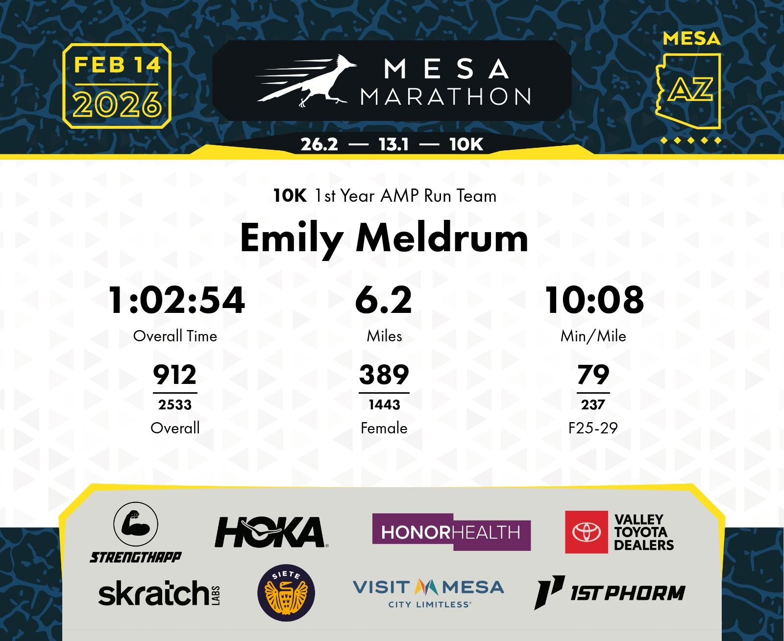 Date: Feb. 14, 2026 Participant: Emily Meldrum #19094 Race: 2026 Mesa 10K Distance: 6.2 miles