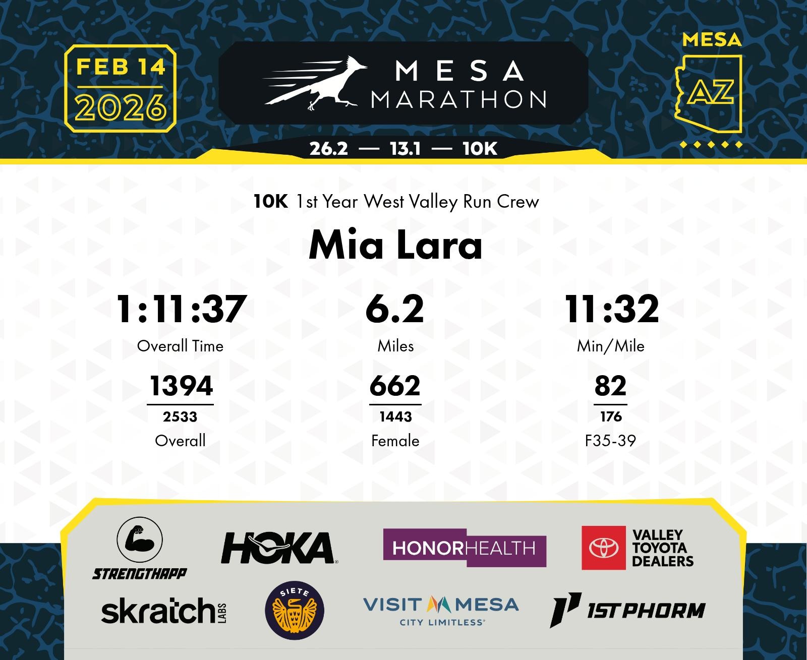 Date: Feb. 14, 2026 Participant: Mia Lara #18907 Race: 2026 Mesa 10K Distance: 6.2 miles
