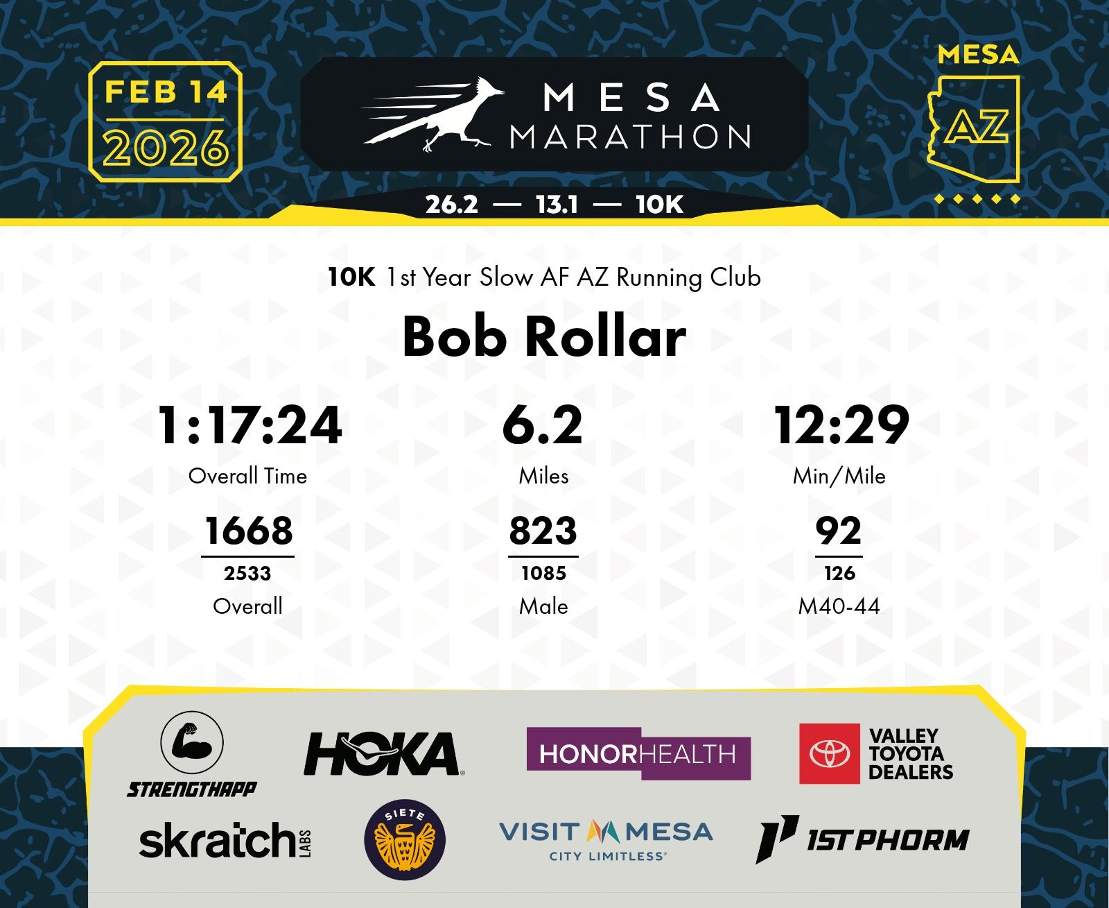 Date: Feb. 14, 2026 Participant: Bob Rollar #19438 Race: 2026 Mesa 10K Distance: 6.2 miles