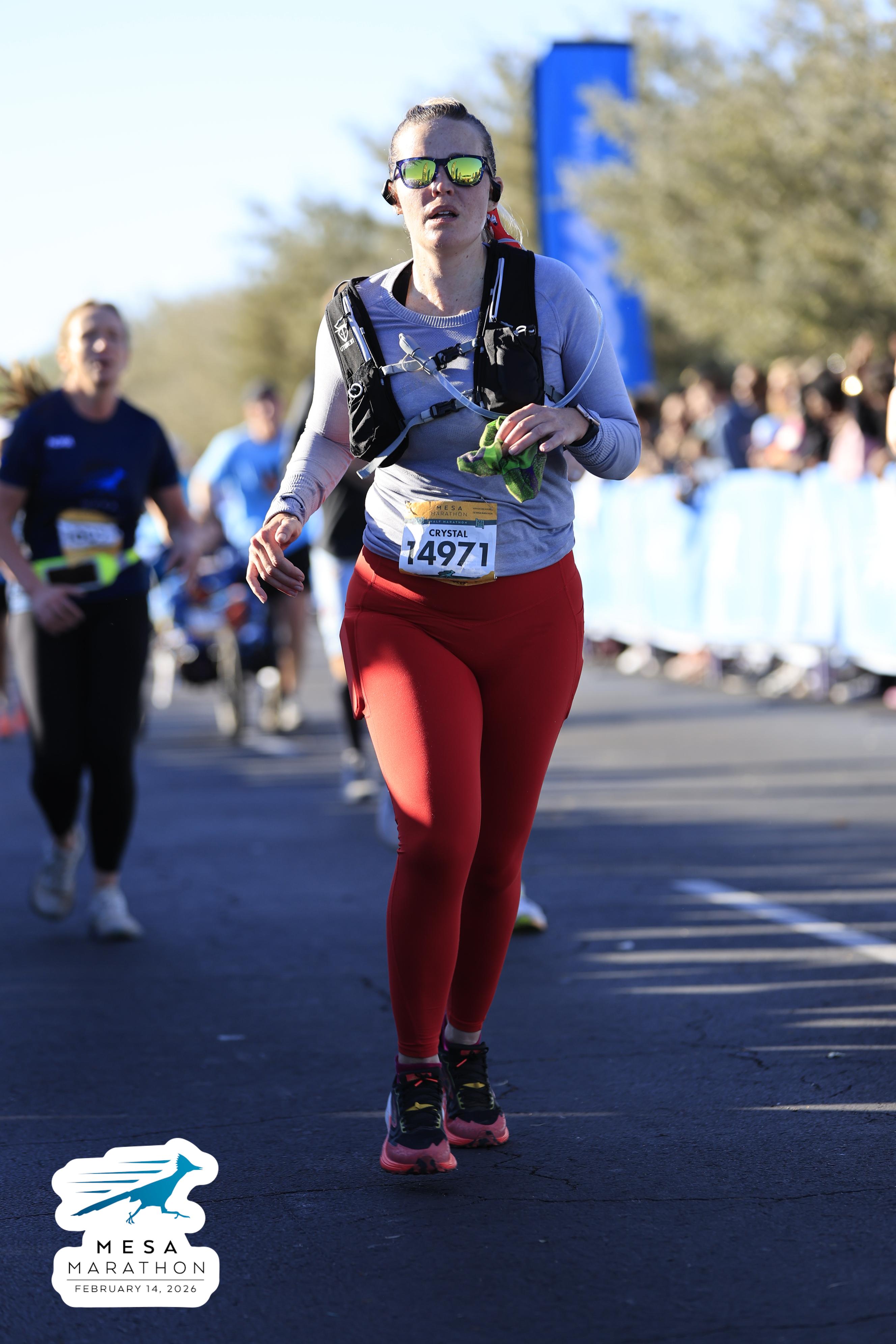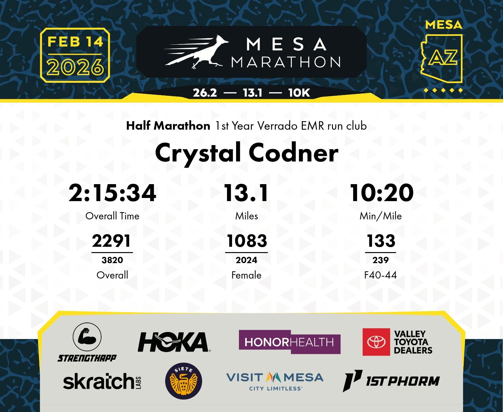 Date: Feb. 14, 2026 Participant: Crystal Codner #14971 Race: 2026 Mesa Half Marathon Distance: 13.1 miles