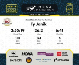 Date: Feb. 14, 2026 Participant: Ty Janik #12141 Race: 2026 Mesa Marathon Distance: 26.2 miles