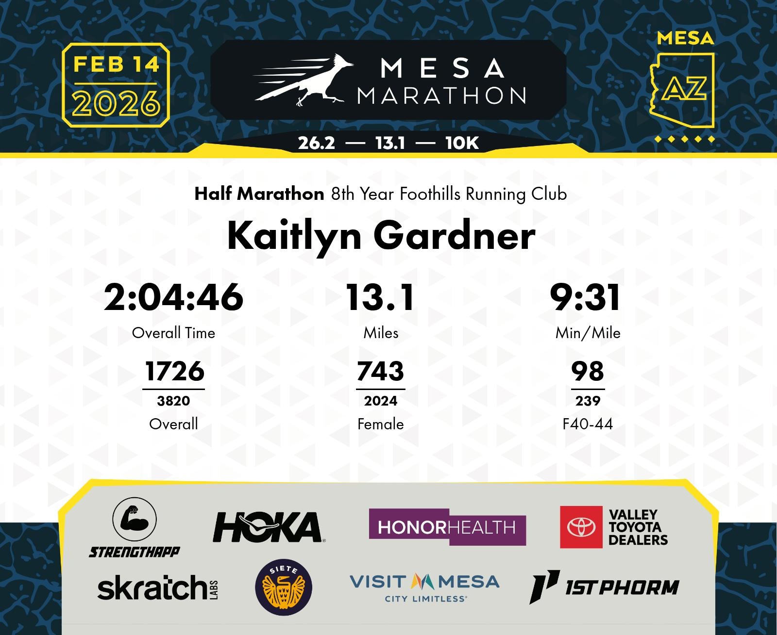 Date: Feb. 14, 2026 Participant: Kaitlyn Gardner #15420 Race: 2026 Mesa Half Marathon Distance: 13.1 miles