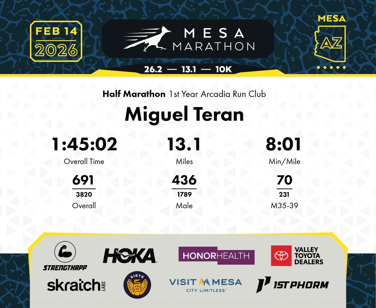 Date: Feb. 14, 2026 Participant: Miguel Teran #17367 Race: 2026 Mesa Half Marathon Distance: 13.1 miles