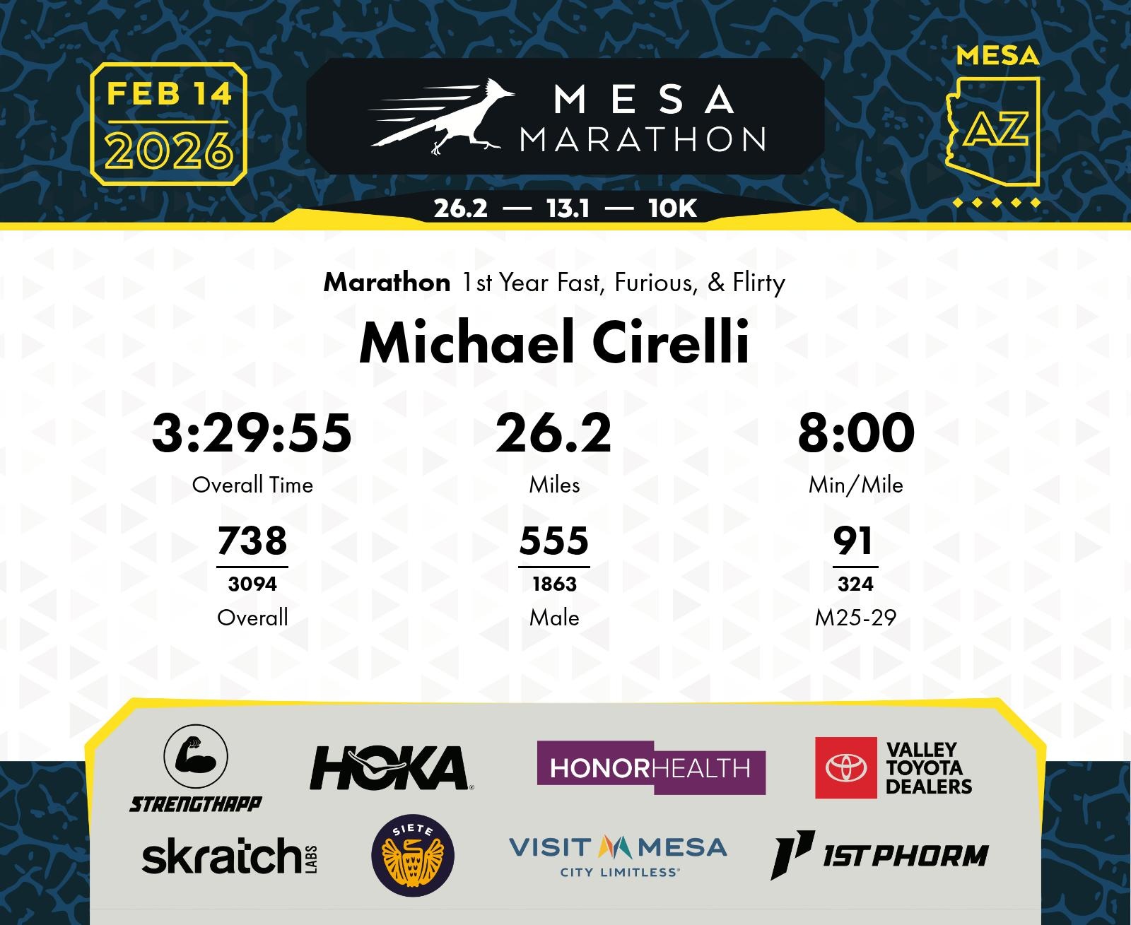 Date: Feb. 14, 2026 Participant: Michael Cirelli #11249 Race: 2026 Mesa Marathon Distance: 26.2 miles