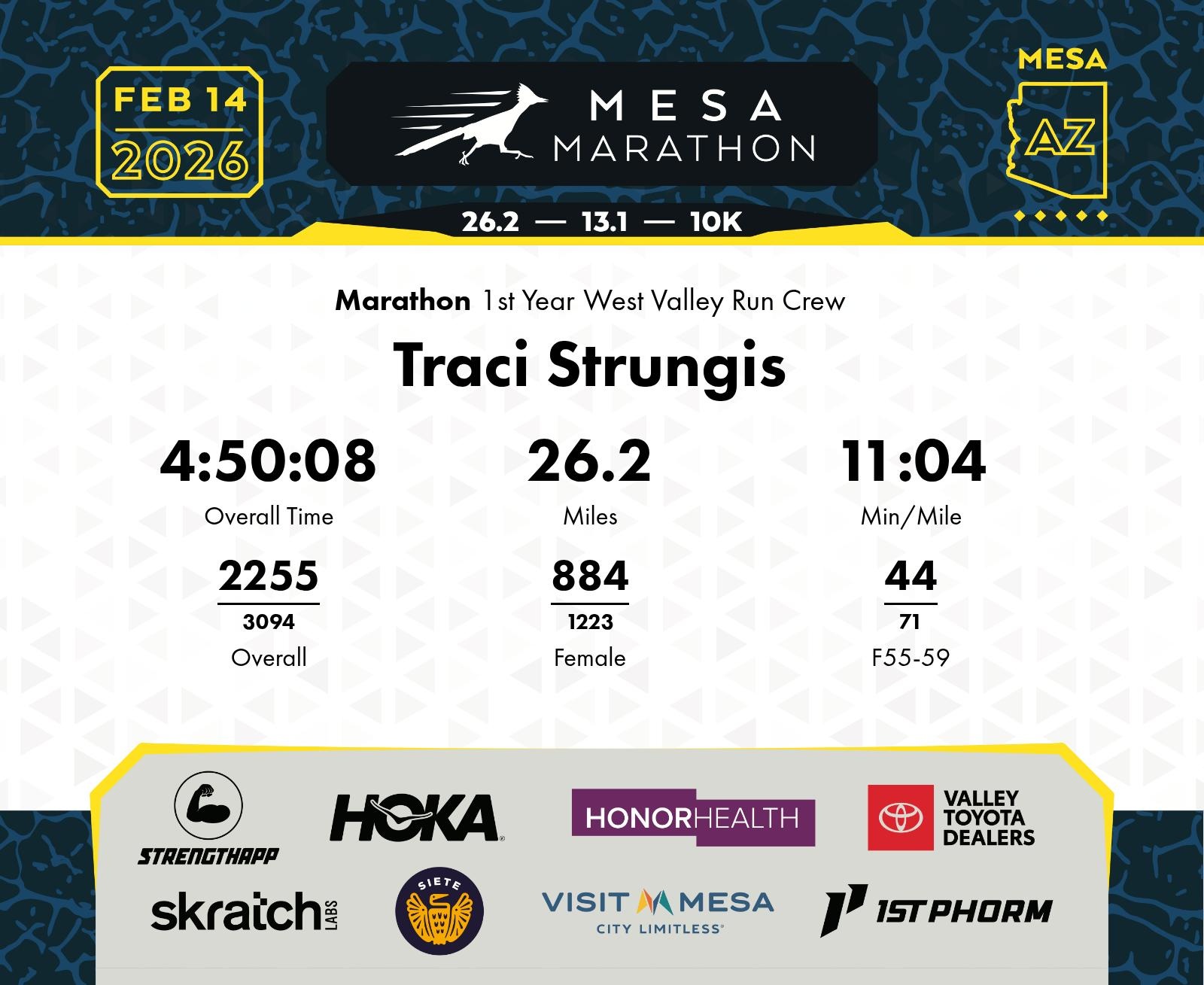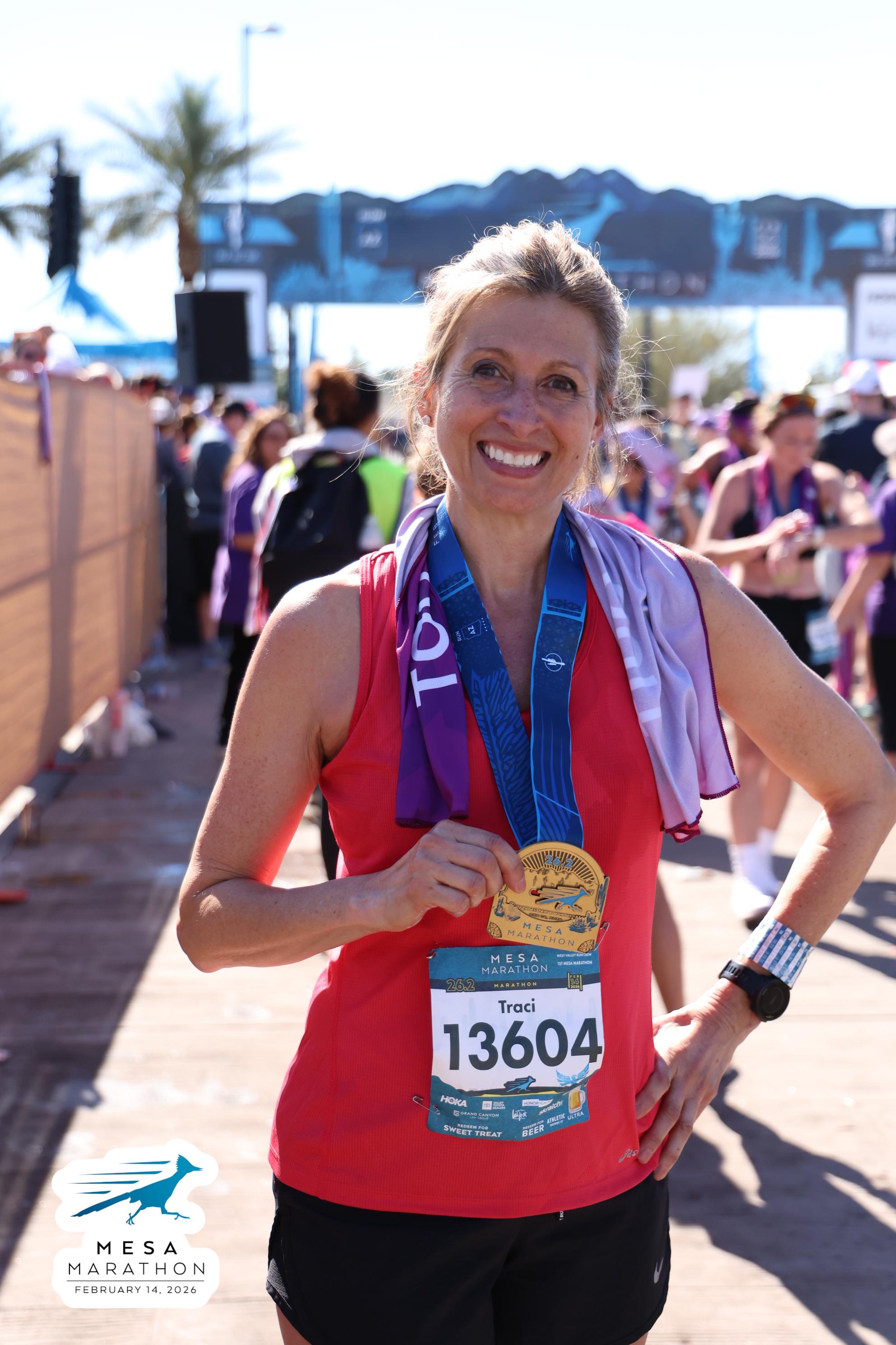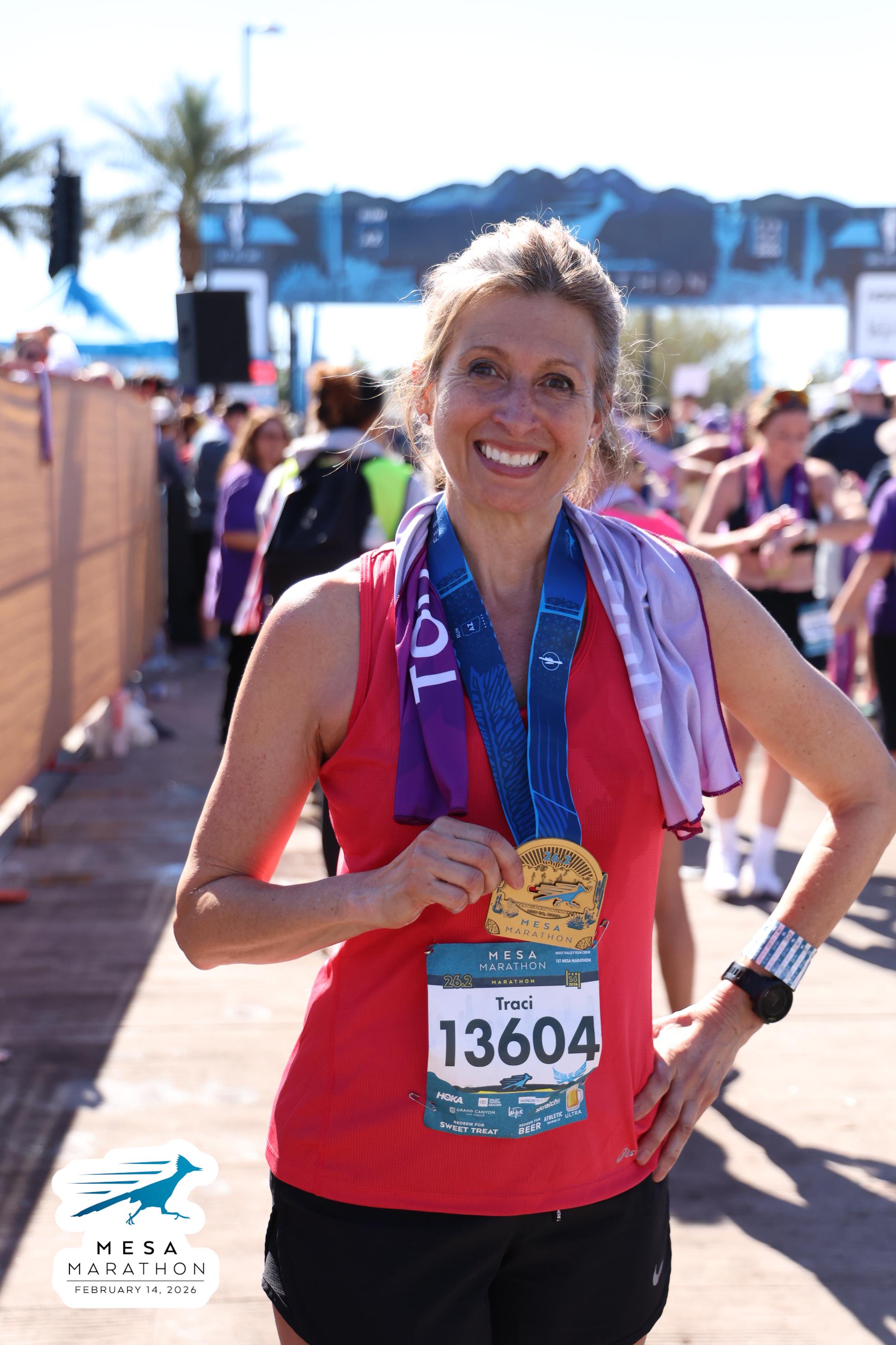Date: Feb. 14, 2026 Participant: Traci Strungis #13604 Race: 2026 Mesa Marathon Distance: 26.2 miles