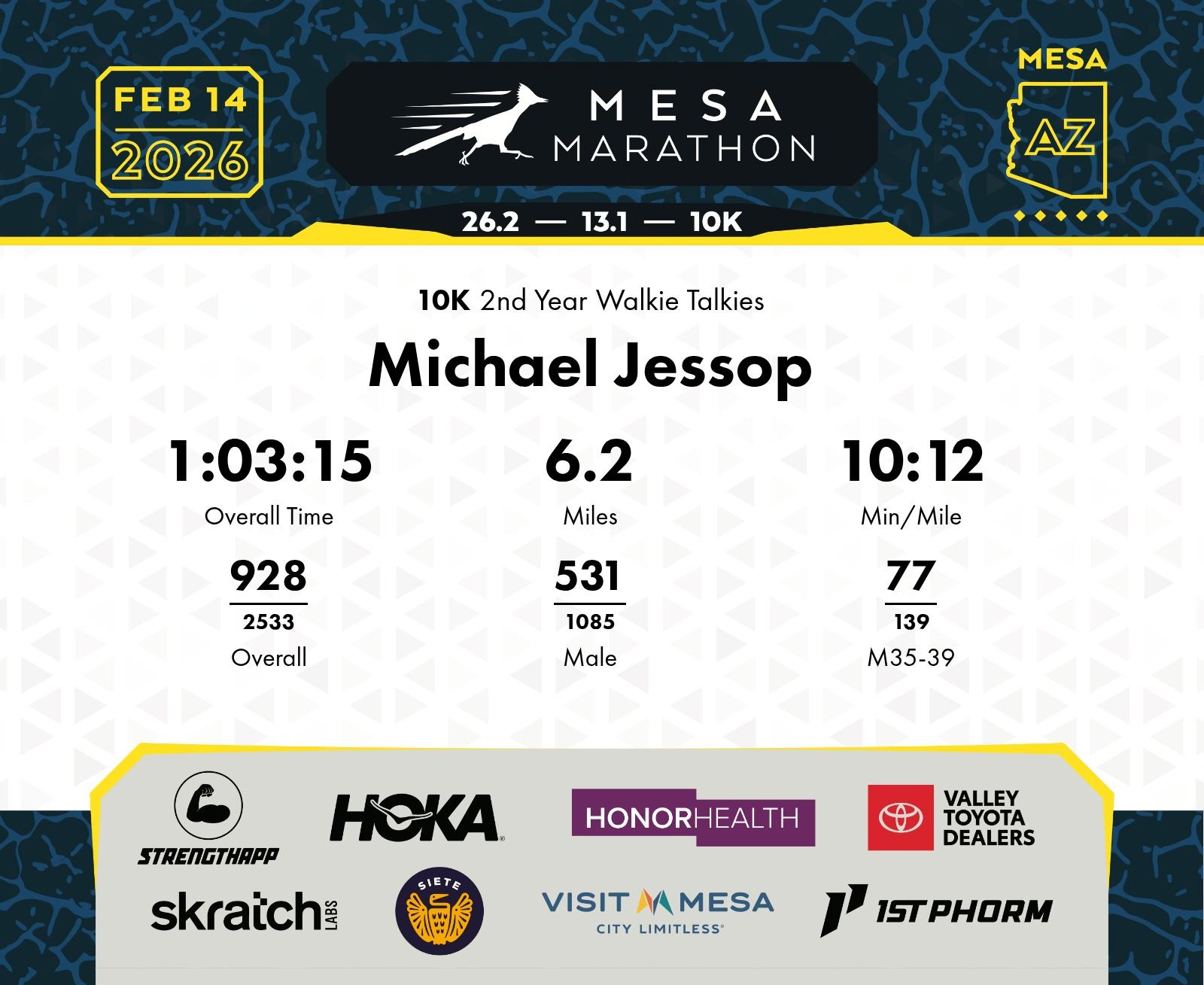 Date: Feb. 14, 2026 Participant: Michael Jessop #18781 Race: 2026 Mesa 10K Distance: 6.2 miles