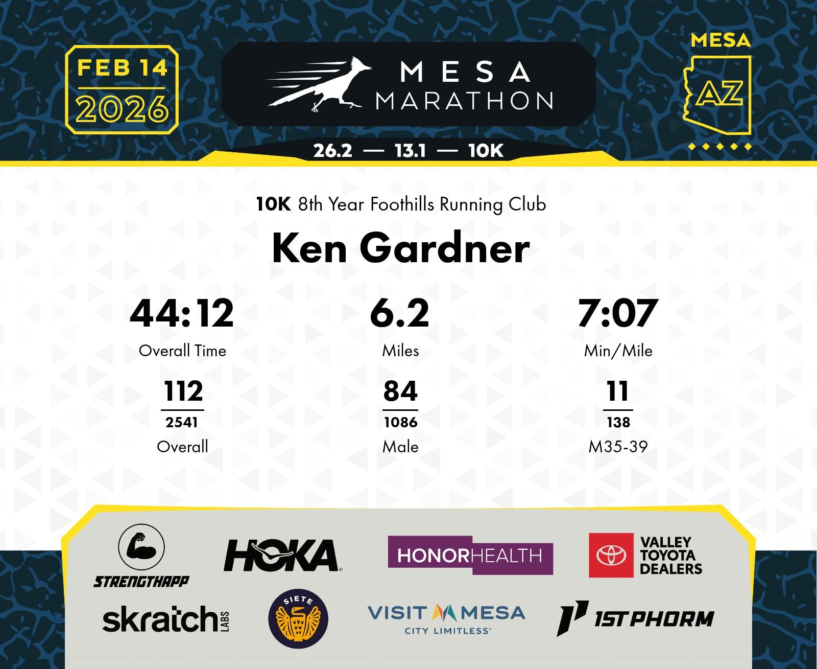 Date: Feb. 14, 2026 Participant: Ken Gardner #18514 Race: 2026 Mesa 10K Distance: 6.2 miles