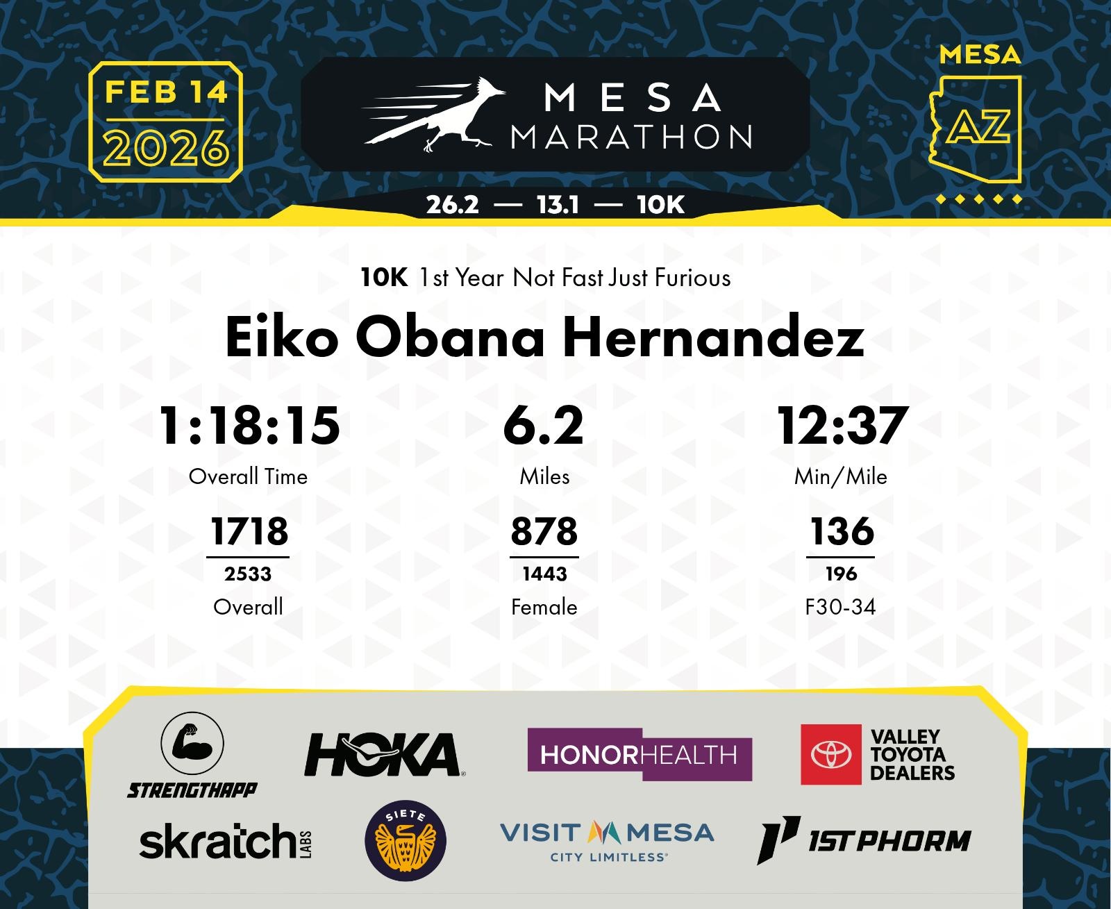 Date: Feb. 14, 2026 Participant: Eiko Obana Hernandez #19228 Race: 2026 Mesa 10K Distance: 6.2 miles