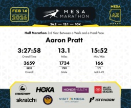Date: Feb. 14, 2026 Participant: Aaron Pratt #16770 Race: 2026 Mesa Half Marathon Distance: 13.1 miles