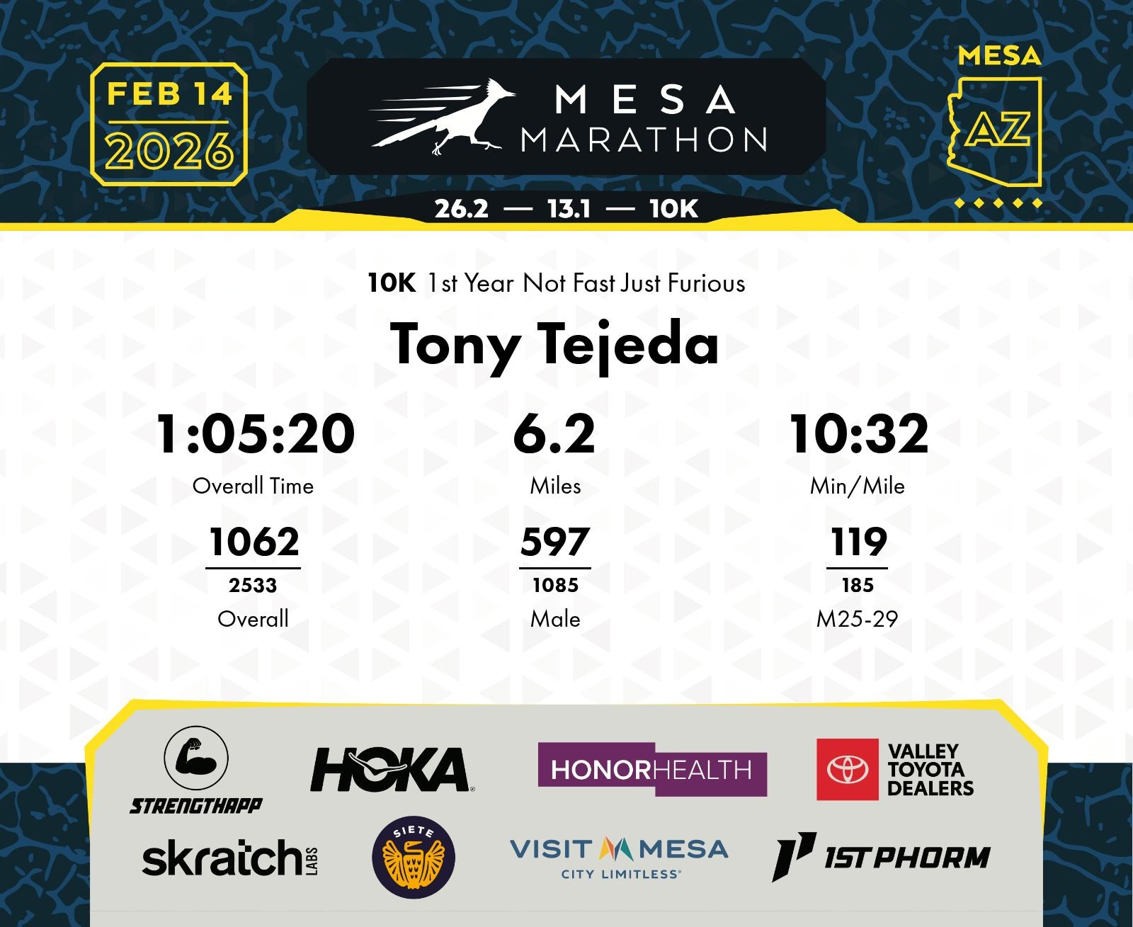 Date: Feb. 14, 2026 Participant: Tony Tejeda #19670 Race: 2026 Mesa 10K Distance: 6.2 miles