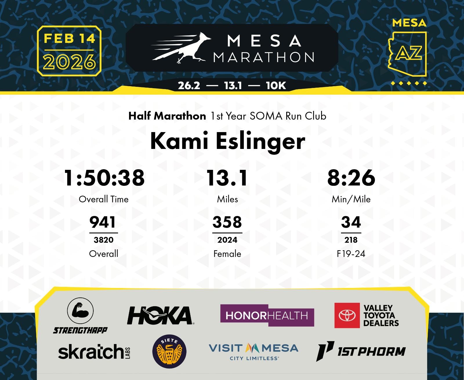 Date: Feb. 14, 2026 Participant: Kami Eslinger #15268 Race: 2026 Mesa Half Marathon Distance: 13.1 miles