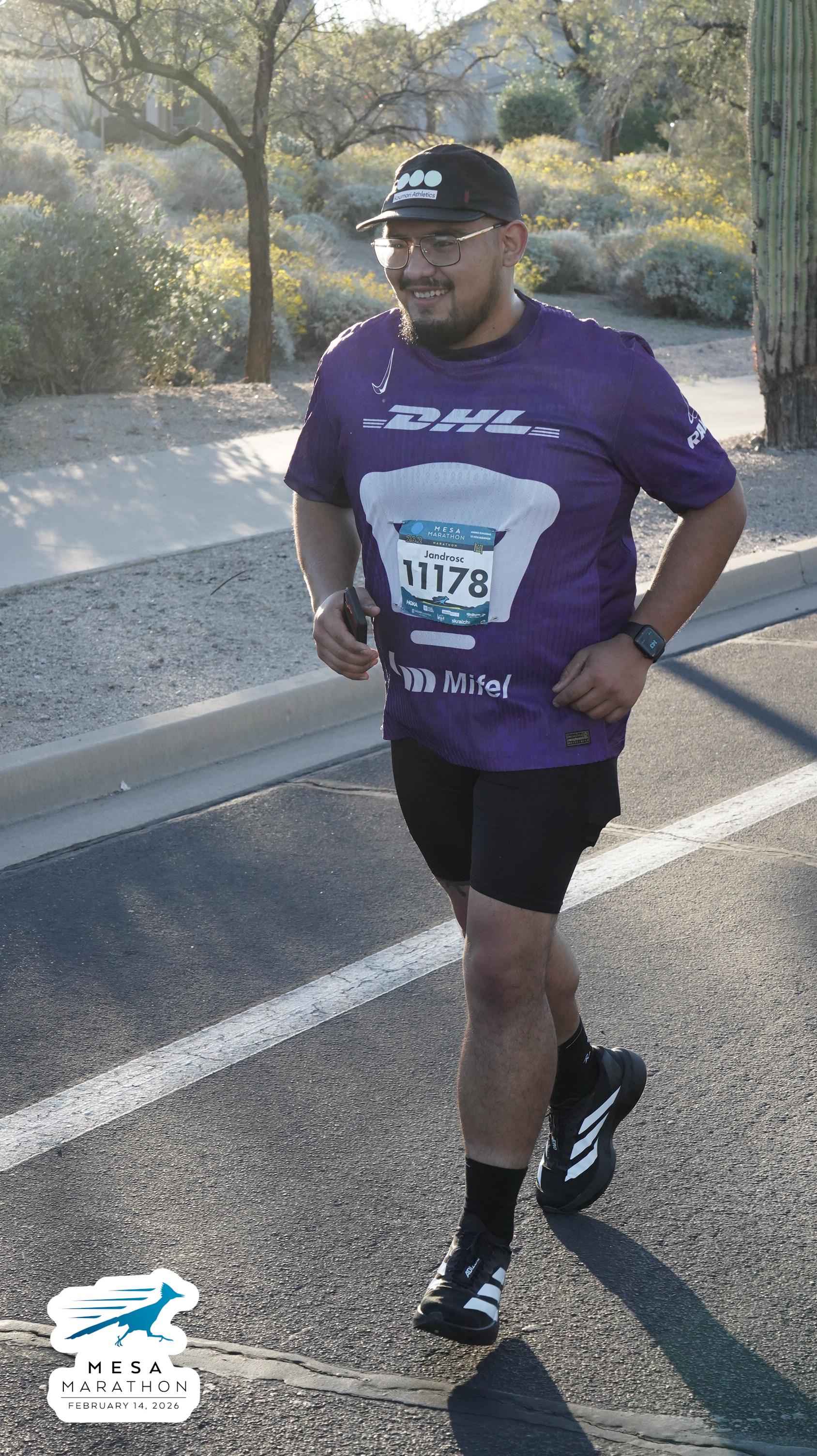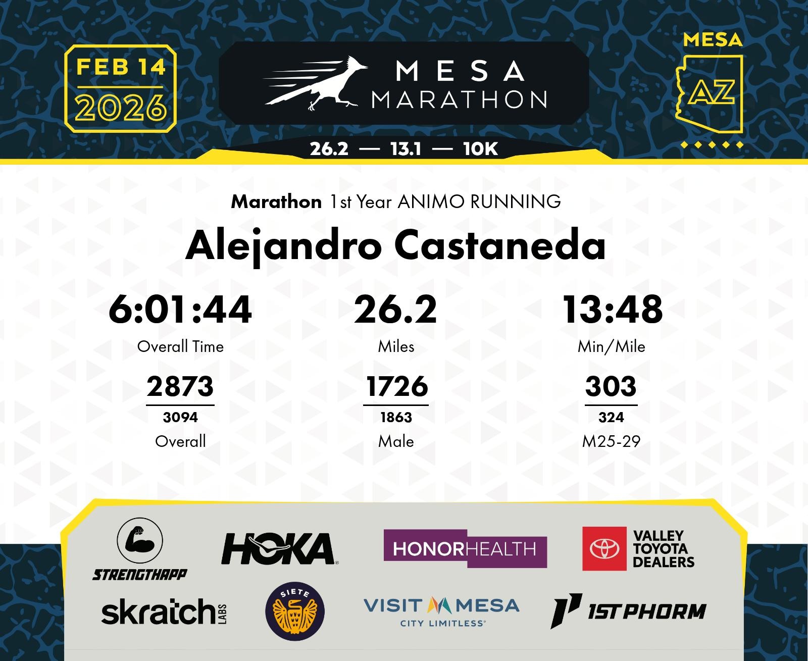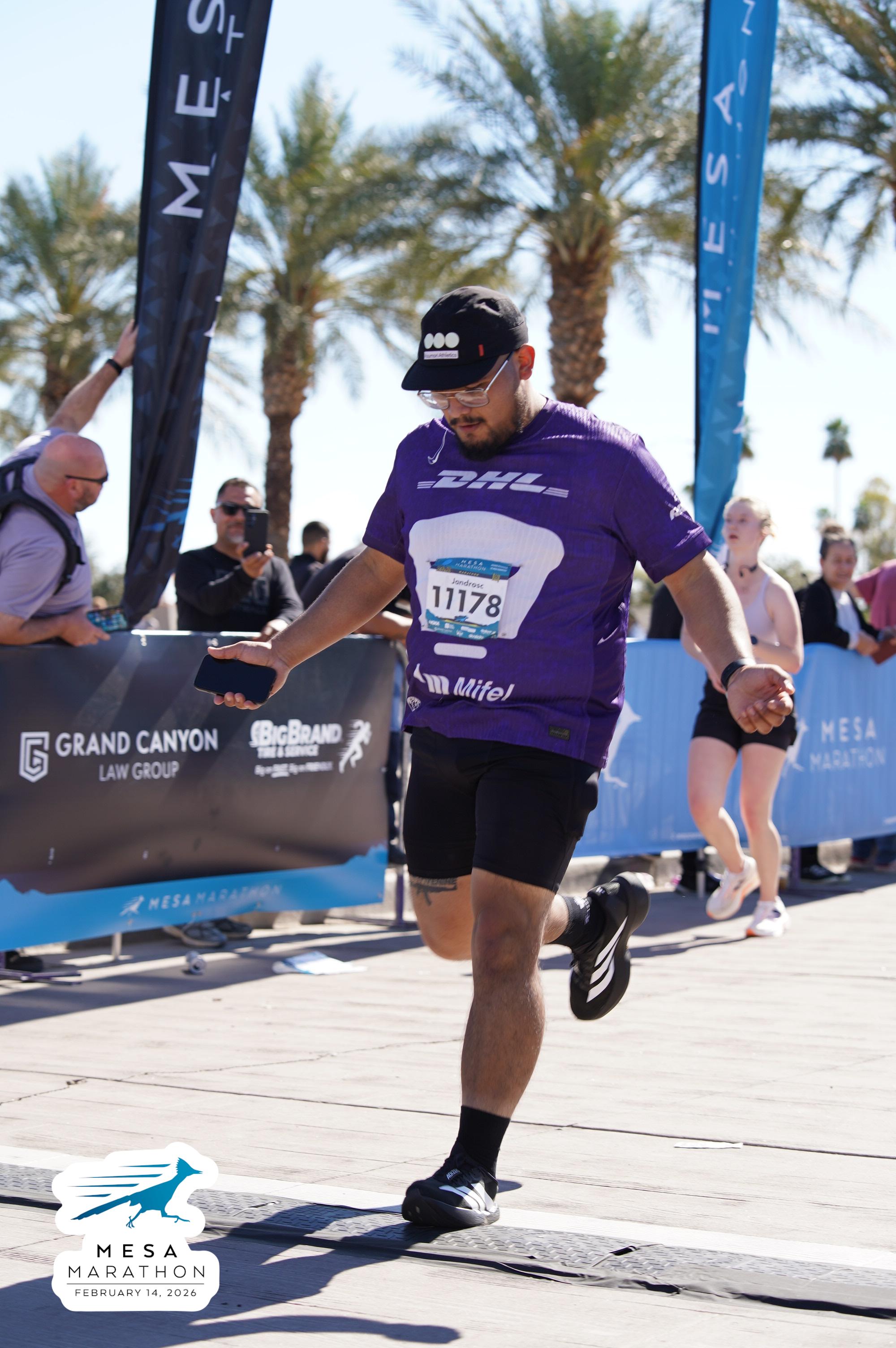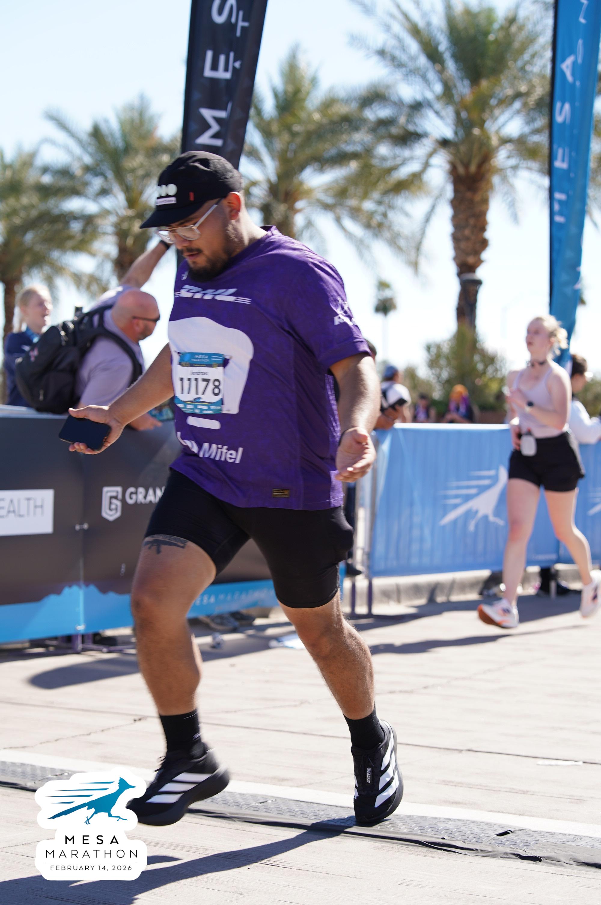 Date: Feb. 14, 2026 Participant: Alejandro Castaneda #11178 Race: 2026 Mesa Marathon Distance: 26.2 miles