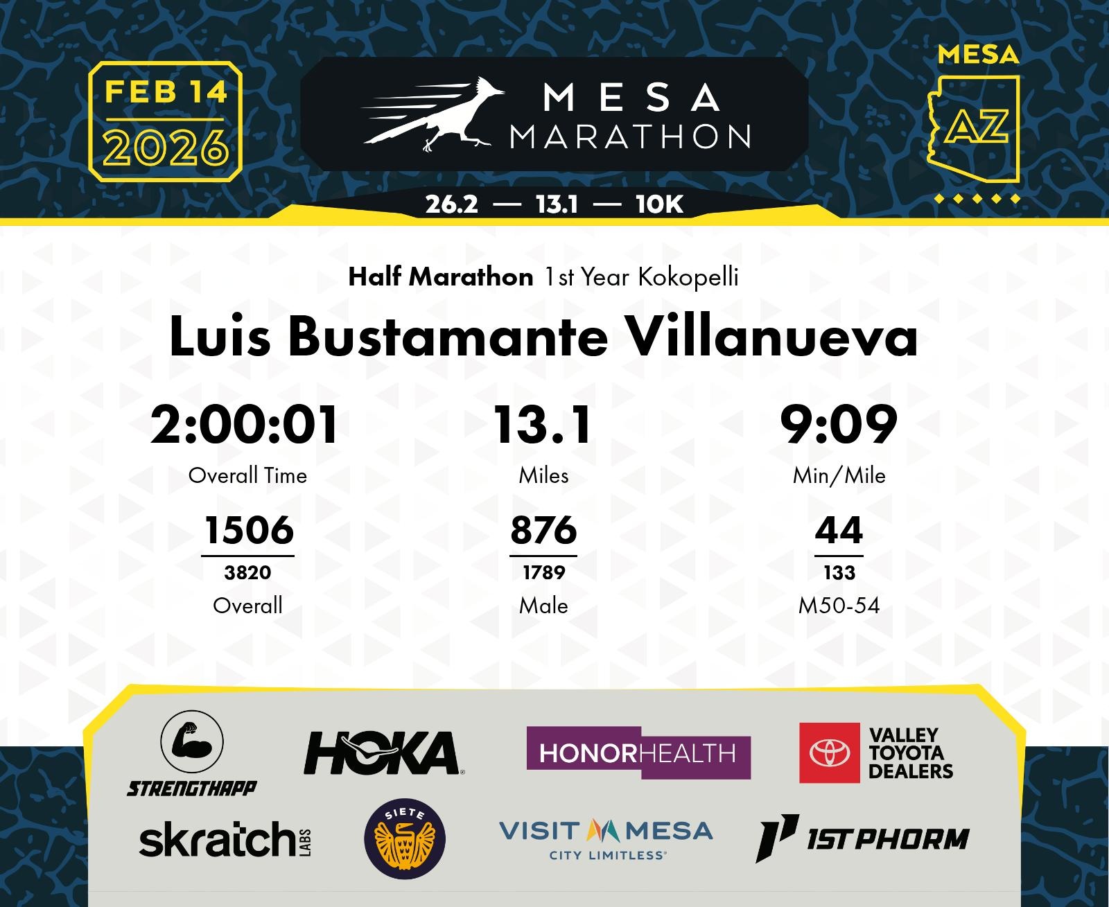 Date: Feb. 14, 2026 Participant: Luis Bustamante Villanueva #14811 Race: 2026 Mesa Half Marathon Distance: 13.1 miles