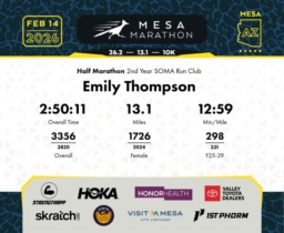 Date: Feb. 14, 2026 Participant: Emily Thompson #17380 Race: 2026 Mesa Half Marathon Distance: 13.1 miles