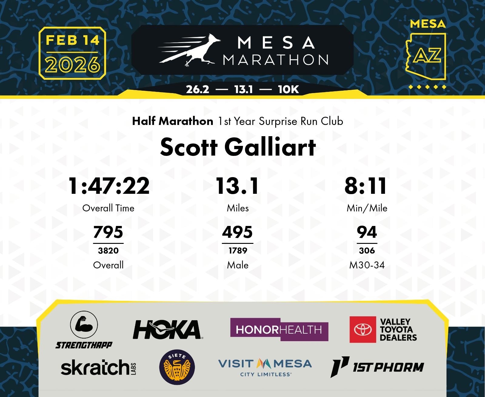 Date: Feb. 14, 2026 Participant: Scott Galliart #15394 Race: 2026 Mesa Half Marathon Distance: 13.1 miles