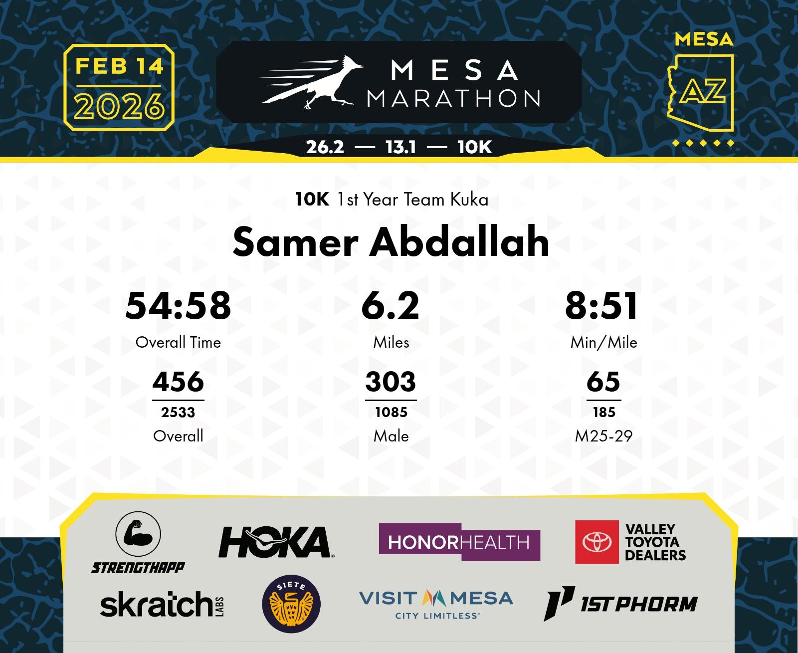 Date: Feb. 14, 2026 Participant: Samer Abdallah #20585 Race: 2026 Mesa 10K Distance: 6.2 miles