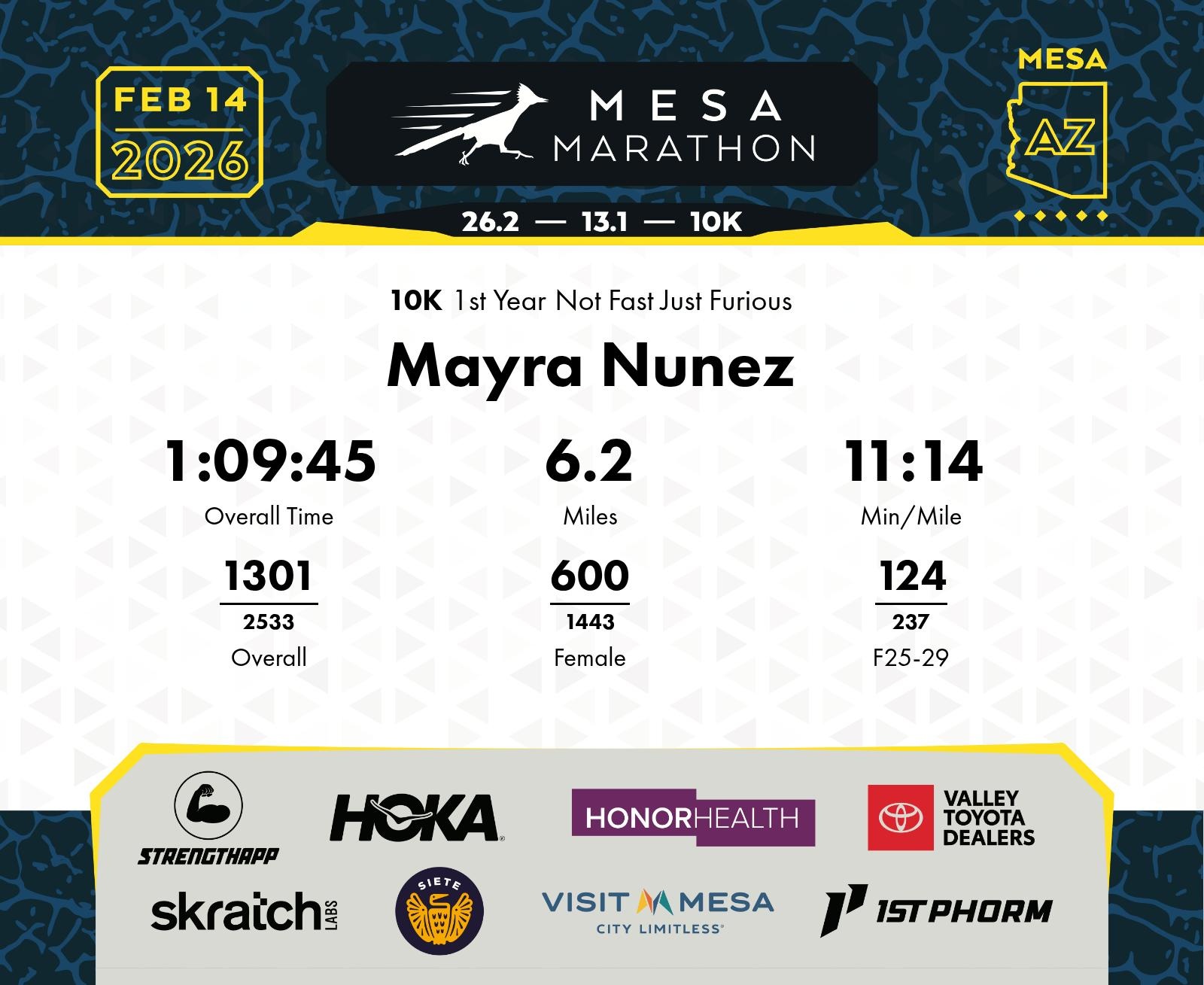 Date: Feb. 14, 2026 Participant: Mayra Nunez #20941 Race: 2026 Mesa 10K Distance: 6.2 miles