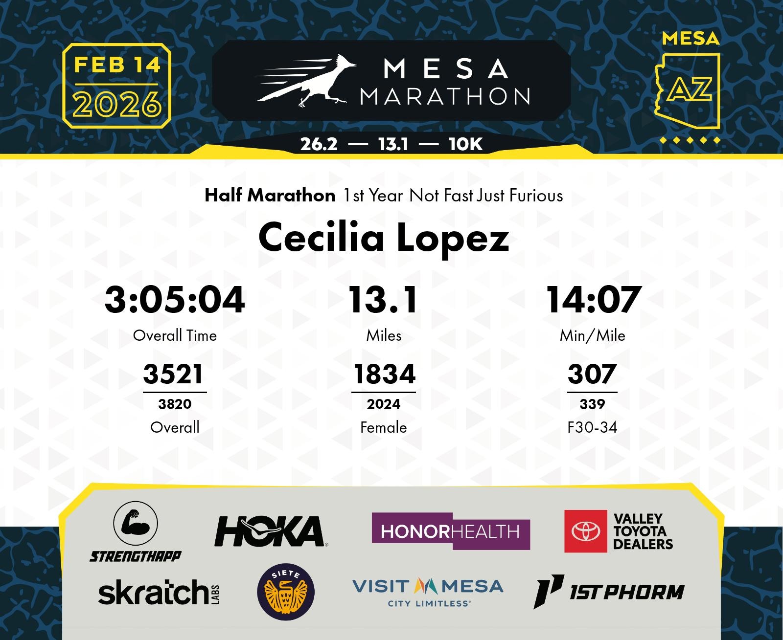 Date: Feb. 14, 2026 Participant: Cecilia Lopez #20300 Race: 2026 Mesa Half Marathon Distance: 13.1 miles