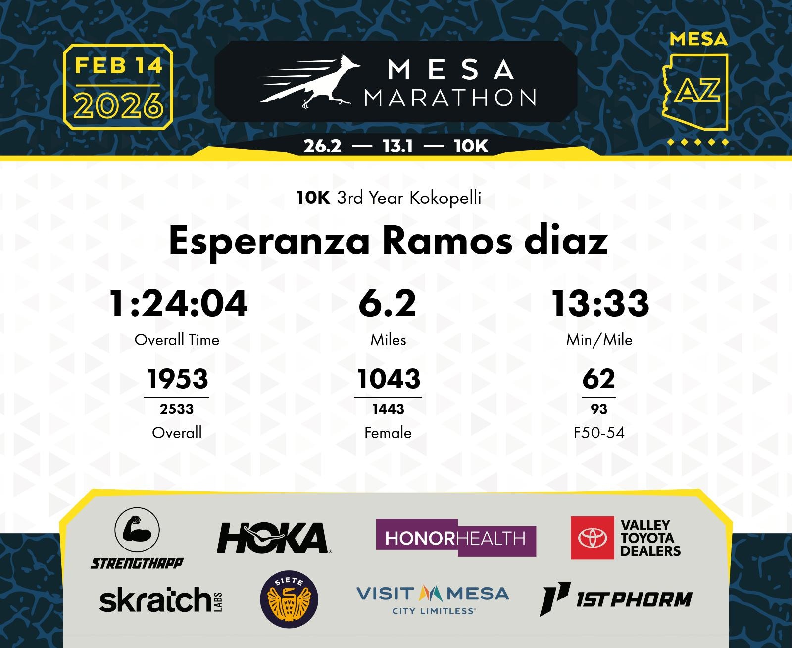 Date: Feb. 14, 2026 Participant: Esperanza Ramos diaz #20988 Race: 2026 Mesa 10K Distance: 6.2 miles