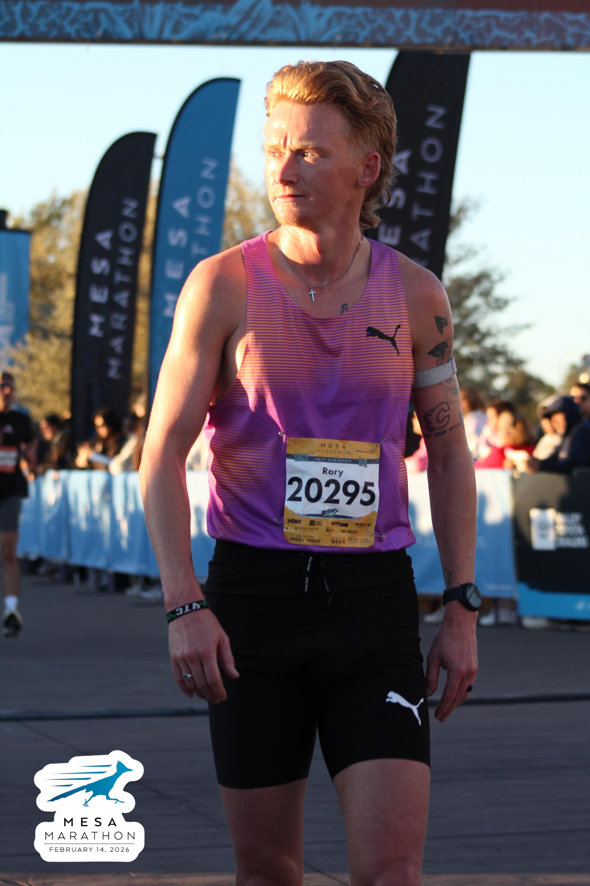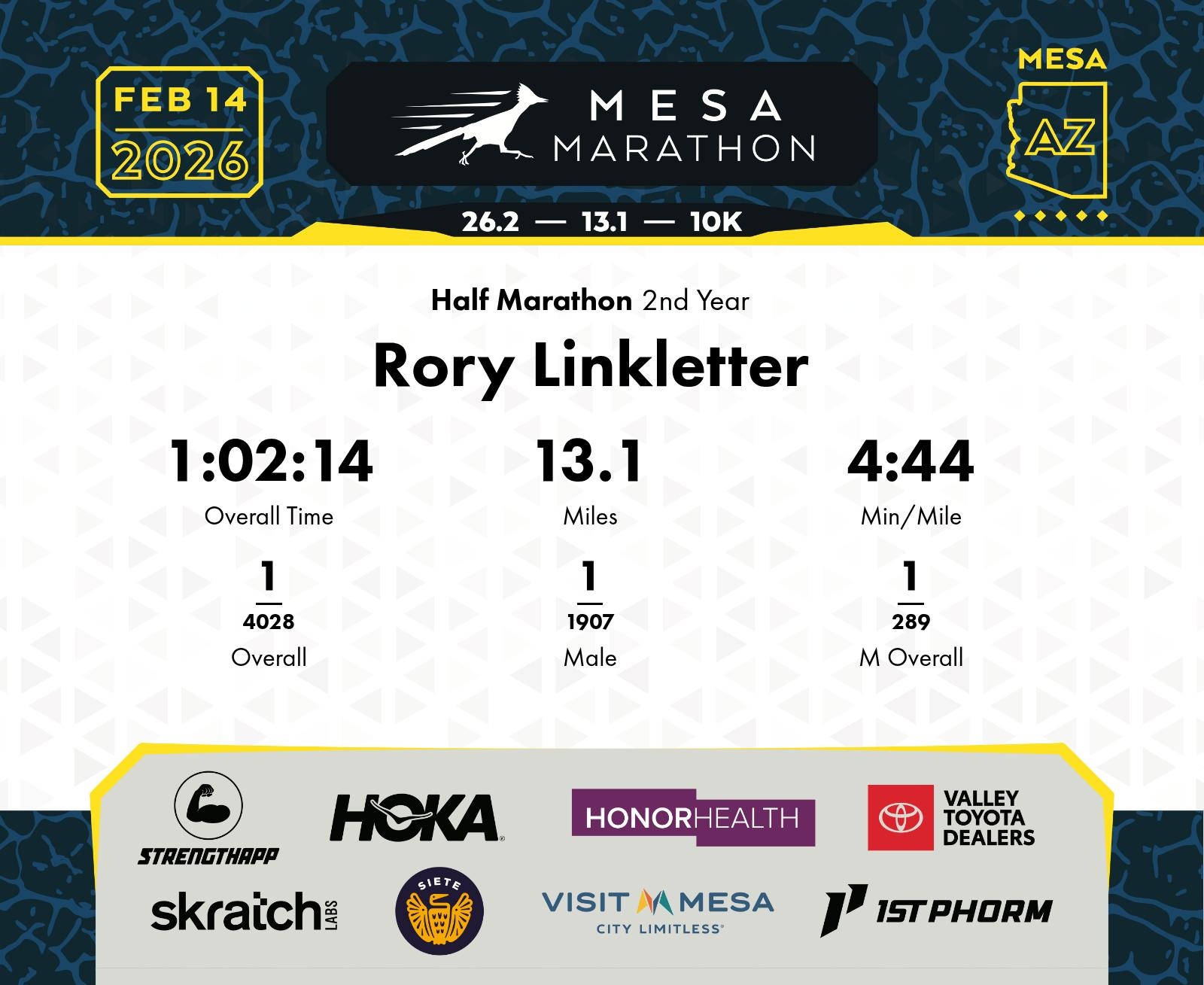 Date: Feb. 14, 2026 Participant: Rory Linkletter #20295 Race: 2026 Mesa Half Marathon Distance: 13.1 miles