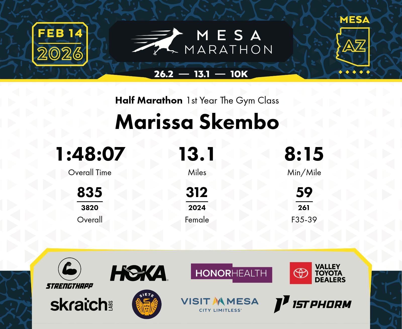 Date: Feb. 14, 2026 Participant: Marissa Skembo #20490 Race: 2026 Mesa Half Marathon Distance: 13.1 miles