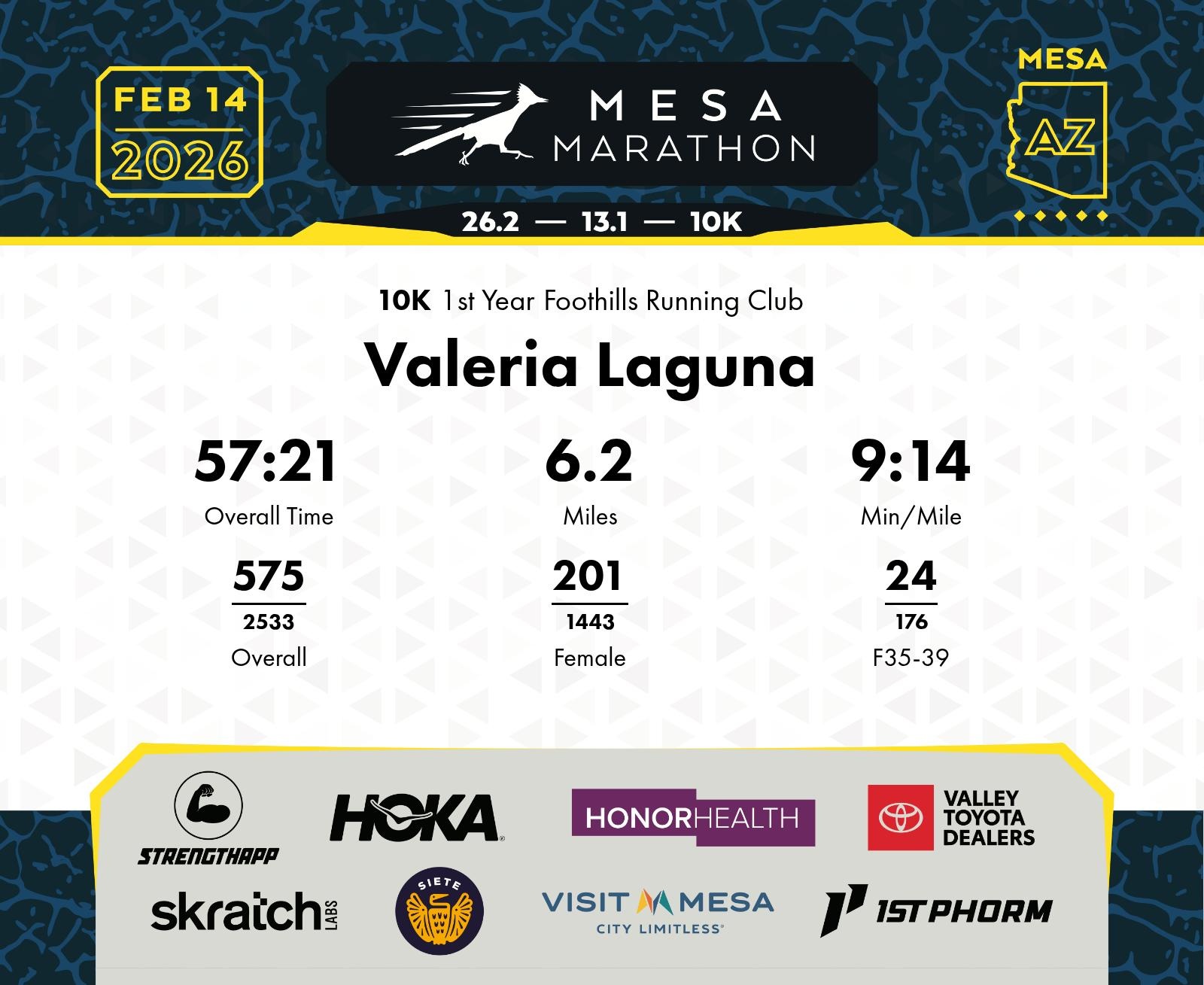 Date: Feb. 14, 2026 Participant: Valeria Laguna #20847 Race: 2026 Mesa 10K Distance: 6.2 miles