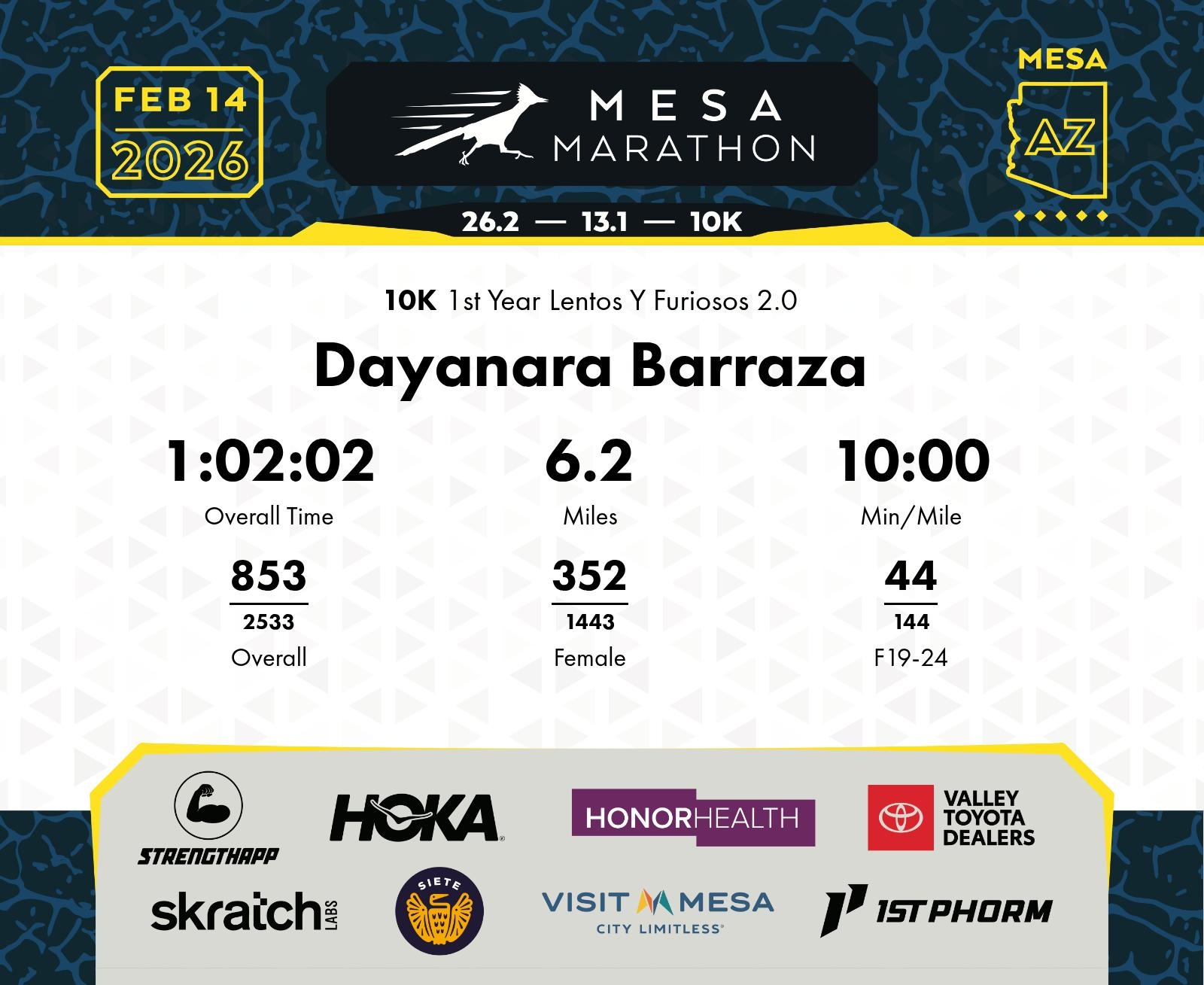 Date: Feb. 14, 2026 Participant: Dayanara Barraza #10424 Race: 2026 Mesa 10K Distance: 6.2 miles